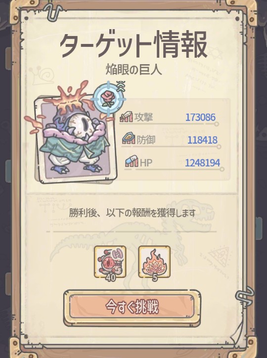「直ちに戦闘!」を選択すると、焔眼の巨人との会話の後、バトルになります。