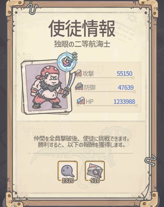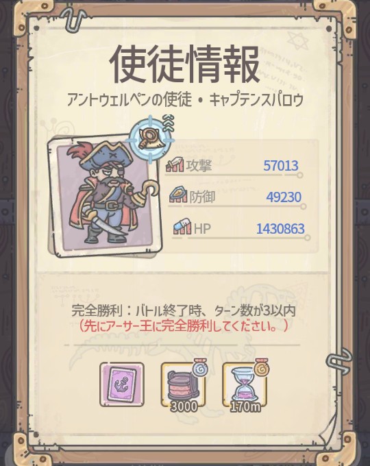 | 8 | アントウェルペン | 配下1 | 独眼の二等航海士 | 55150 | 47639 | 1233988 | 教養54330 | 2,450,000 | - |