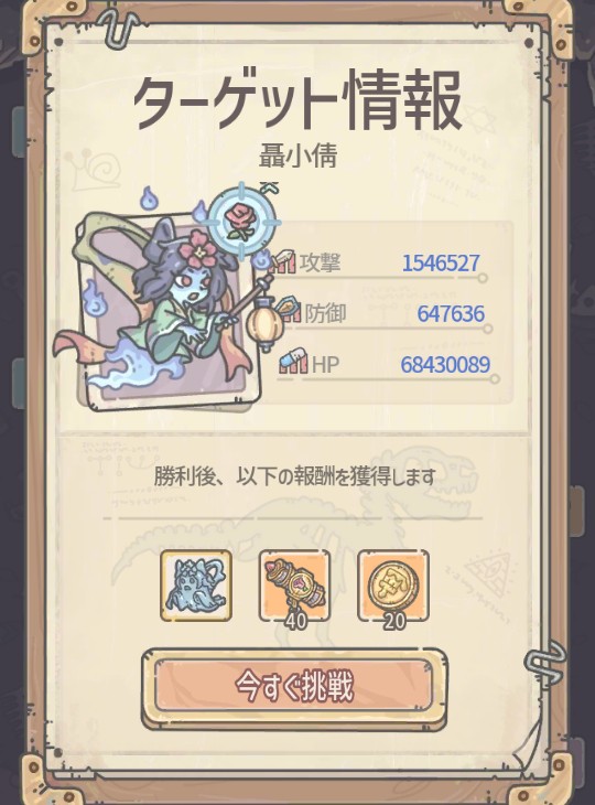 | 勝利報酬 | 古代貨幣+400 奉納加速+6h 日光エサ+1 |