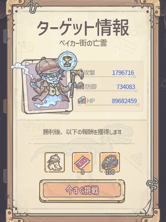 | 勝利報酬 | アイテム「ベイカー街の亡霊」 ガチャ券+8 魂の宝箱+100 |